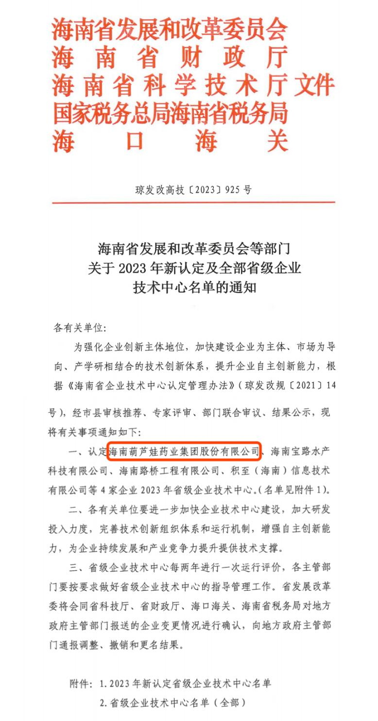 近日,海南省发改委等多部门联合公布了《关于2023年新认定及全部省级企业技术中心名单的通知》,其中,海南尊龙凯龙时人生就是博网址药业集团股份有限公司成功通过评审,被认定为省级企业技术中心,是本次获批的4家企业之一。